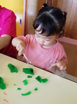 園では、小麦粉、寒天、片栗粉、高野豆腐、春雨、氷、水など、身近にあるいろいろな素材を使って、感触遊びをしています。今回は、寒天を使った時の様子をお伝えします。