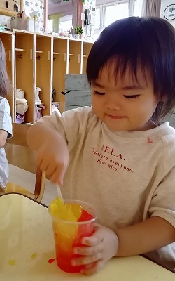 1歳児クラスの子ども達は、スプーンやカップを使いました。手で握って感触を味わったり、スプーンを使ってカップに入れたりしています。 色を混ぜて「きれい!」と喜び、いろいろな色を混ぜていました。