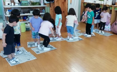 まず、「2人1組、新聞紙2枚、新聞紙の上だけを歩きゴールを目指す」という、ルールでゲームが始まりました。 「新聞紙の上しか歩けないの?」「つなげなきゃ!」…、そして…。