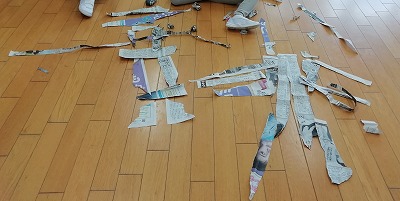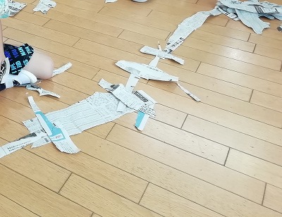 遊びが変わり、今度は新聞紙を細長くちぎり、2人で協力して形を作ります。 「人とカブトムシ!」「おうち!」、そして、「道路工事中だよ!」。