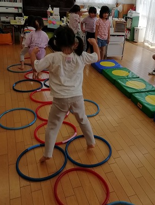 3、4、5歳児クラスでは、サーキット遊びやリズム遊びを取り入れています。サーキット遊びでは、リズミカルにフープを跳び、ジャンプ・マットでは両足を揃えてジャンプ。