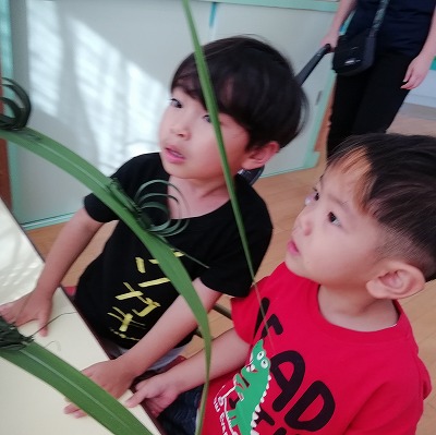 2、3歳児クラスの子ども達は、本物と思ったのか、少し離れた場所から、じっと見ていました。 バッタもカタツムリも動かないので、なんとも不思議そうな表情です。