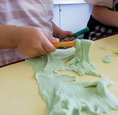 色の小麦粉粘土を手の平全体を使って混ぜ、色の変化を楽しんでいます。