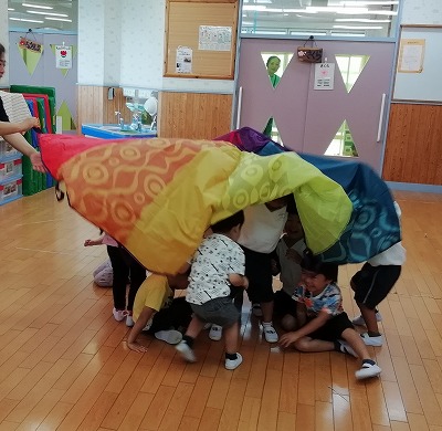 誰もいなくなっちゃった…。 バルーンの中から「ウフフッ」「エヘヘ…」「シー。見つかっちゃうよ」と小声で話す声が聞こえてきました。保育者は「あれ? どこへ行っちゃったの?」「みんな、どこかな?」と探しました! 大技、大成功です。