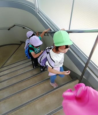 階段を登って展望台に向かい…、「あっ! さっきのカッパが見える!! 4人だったんだね」(展望台から見て4体いることに気がつきました)」、「手賀沼、広いね」など、下から見た景色との違いに気づいたり、遠くの富士山やスカイツリー、筑波山を探したりしていました。