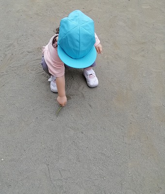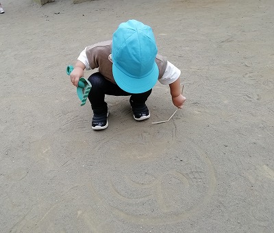 保育者が地面に絵を描いていると、子ども達も集まってきて、お絵描きタイムが始まりました。 棒やシャベルを使って描く子もおり、道具を使った線の違いに気づいたようです。