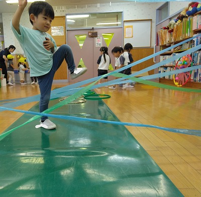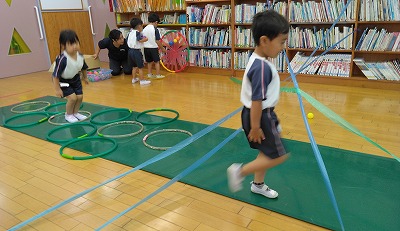 慣れてくると、たくさん足を開き、1個飛ばしで進んでいる子ども達もいました。