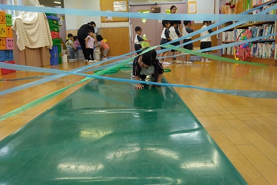 次に待っているのは、クモの巣くぐり(クモの巣はスズランテープでつくりました)。「どうやって進もうかな?」と慎重に考えてからスタート。 クモの巣にあたらないように姿勢を低くして、