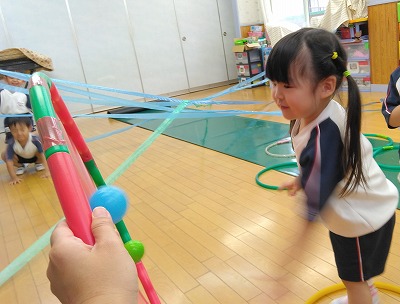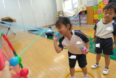 10月5日にうんどうまつりを終えた3歳児クラスの子ども達は、今もうんどう遊びに夢中です。この日は、フープ跳び、クモの巣くぐり、ボール投げをしました。