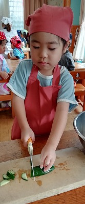「左手は猫の手にするんだよね」 とコツを覚えている子ども達。保育園では初めての包丁でしたが 、みんな、キュウリをじょうずに切っていました。