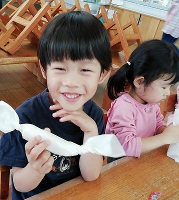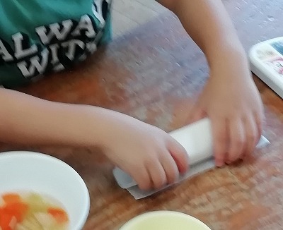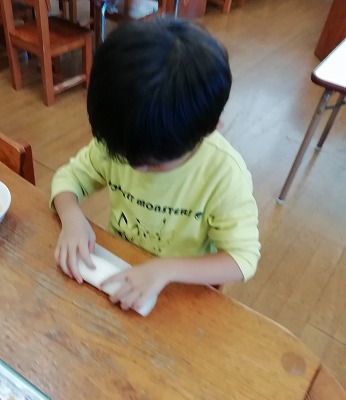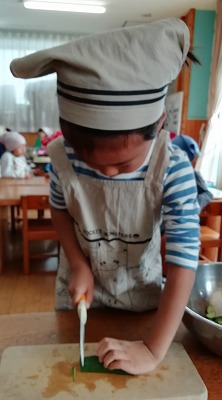 3~5歳児クラスの子ども達がクッキングをしました。メニューは、ロールサンド、グリーンサラダ、コンソメスープと照り焼きチキン(これは給食から)です。写真は、4歳児の様子です。