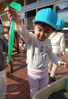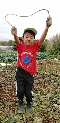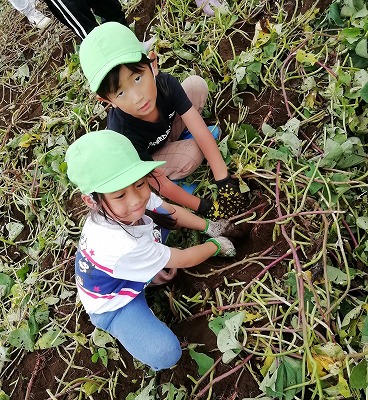 「ここに大きいのがあるんだよ」と、顔を出しているサツマイモを掘っていますが、なかなか取れません。がんばりました!