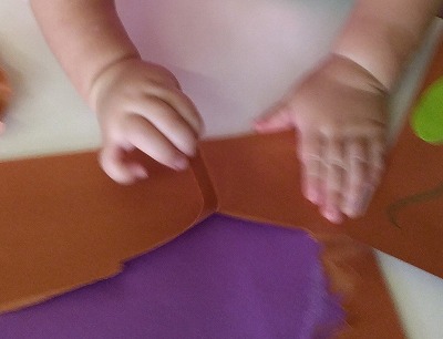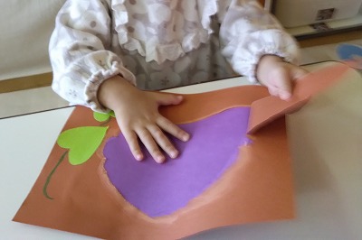 茶色の画用紙(土)をちぎって(掘って)いくと…。 少しずつサツマイモが見えてきて、大きなサツマイモができあがります。指先を使ってそーっとちぎる子どもや、