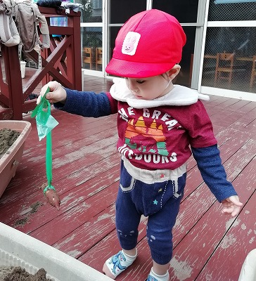 サツマイモ掘りに行った5歳児クラスの子ども達からサツマイモのお土産をもらったことをきっかけに、0歳児、1歳児クラスの子ども達もサツマイモや芋ほりに興味を持った様子。そこで、イモ掘りごっこをしました。