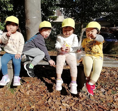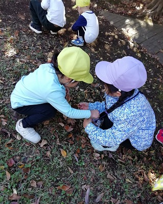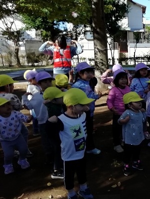 柏鳳保育園から徒歩2分の所にある中峠台鹿島前公園へ、秋の自然を見つけに出かけました。4歳児クラスのお兄さん、お姉さんと一緒です。