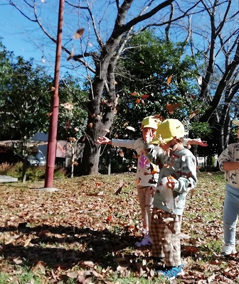 落ち葉を集めて空に舞い上げます! ヒラヒラと落ちてくる葉っぱがキレイでした。