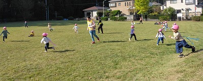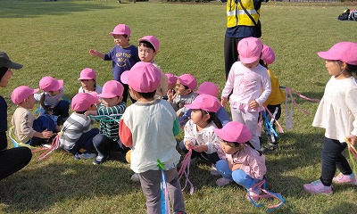 公園に到着。人気の「しっぽとりゲーム」からスタート。この公園は芝生がとても広いので、しっぽ取りや追いかけっこをたくさん、たくさんできます。