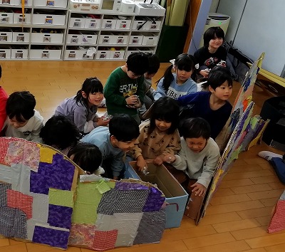 「鬼は外〜! 鬼は外~!」、みんなで作った新聞豆を投げると、鬼は背を向けて逃げていきます