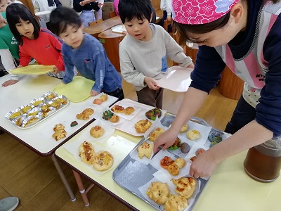 5歳児クラスの子ども達は、コーンやハムを生地の上にのせたり、ウインナーを巻いたりして形を作り、ケチャップやマヨネーズをかけて焼きました。