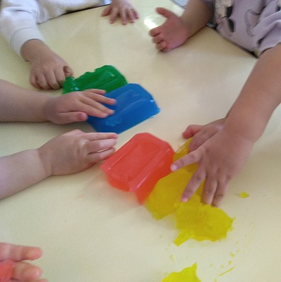 この日、1歳児クラスの子ども達は、園庭で遊ぶグループと、室内で感触遊びを行うグループに分かれて過ごしていました。