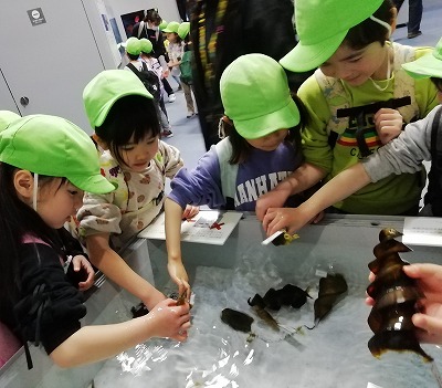 大きな水槽では、イワシが大群で泳ぐ様子を「スイミーみたいだね~」と眺めていました。 また、タッチコーナーでは、実際に生き物に触れることができました。