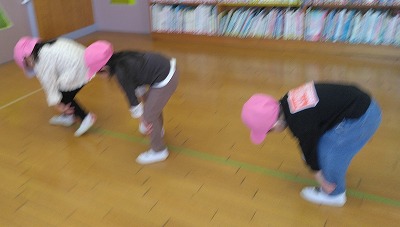 さらに、アヒル歩き。しゃがんで前に進みます。足首をやわらかく交互に出して進みます。足のおくりも上手になりました。