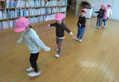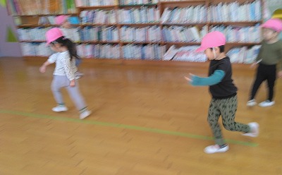 この日、3歳児クラスの子ども達は、床の上に貼った直線を使って、歩く、走る、またぐ、跳ぶなど、体幹を鍛える運動遊びを行いました。(動いている時の写真なので、ぼやけているものがあります)。