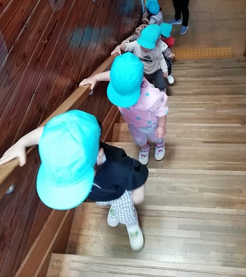 新2歳児クラスの子ども達は、進級して部屋が1階から2階に変わりました。お引っ越し後、早速、園内探索が始まりました。これまで何度も行き来している場所ですが、部屋が変わることは子ども達にとって大きな変化です。