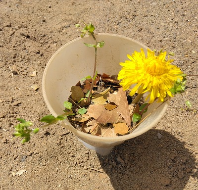 バケツに土や枯れ葉、たんぽぽを入れている子どもがいたので、「何をしているの?」と聞いてみると、「アリさんのおうち、つくってるの」と教えてくれました。完成すると、その中にアリを入れ、様子を観察していました。
