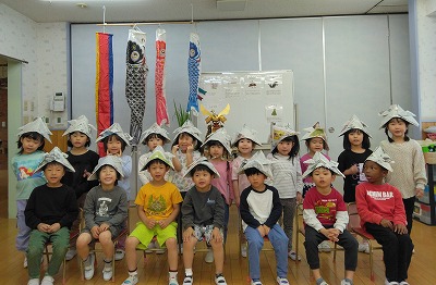 別の日に、こどもの日の由来を聞いた年長児クラスの子ども達は、柏もちやちまきの由来、鯉のぼりを飾る理由などにも興味を持ったようです。 保育者が新聞紙で作ったカブト(兜)をかぶって見せると、「作りたい!」と、カブト作りが始まりました。「ここを折るんだよ」と友だちと教え合いながら作り、「できた!」と大喜びです。