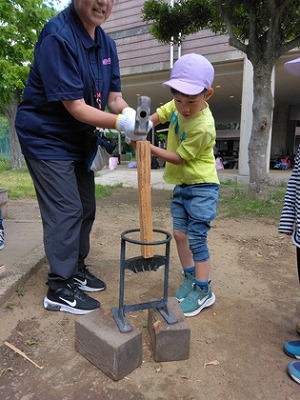 「薪割りにも挑戦したい!」と、ハンマーと薪割り機を使って割りました。力加減も木の太さに合わせていました。