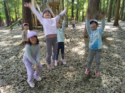 公園までの短い道のりの間でも、5歳児クラスの子ども達が手をつないだ4歳児クラスの子に、前の人との間隔をあけすぎないこと、人の家に入らないこと、止まる所などを上手に伝えていました。卒園したお兄さん、お姉さん達から教わってきたことを、今度は自分たちが教えていくんだと思ったのでしょう。関わりの中で学びがつながっていく場面でした。
