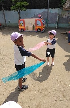 風が強いある日、園庭で遊んでいる子ども達に、「これで遊んでみる?」とスカーフを渡してみました。