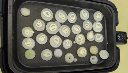 ホットプレートを使っているなら、他にも何かできないかな?と、園長が新玉ねぎを持ってきました(なぜ、新玉ねぎがあったのかは…? 先日の飯盒炊飯に、巨大なインスタント焼きそばを持ってきたのも園長です)。
