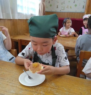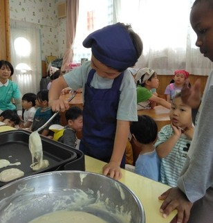 翌日は、念願のホットケーキ・パーティです。生地づくりから始め、「ぷくぷくになったらひっくり返すんだよね」と上手に焼いていきます。 5歳児クラスと4歳児クラスは自分で焼き、3歳児クラスの子ども達のぶんは、5歳児クラスの子ども達が焼いてくれました。