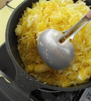 薄皮をむいて鍋に入れ、火にかけて煮詰めていきました。段々とジャムらしくなっていく様子に釘付けです。