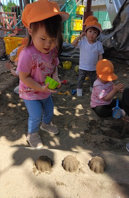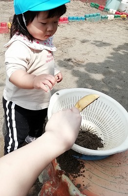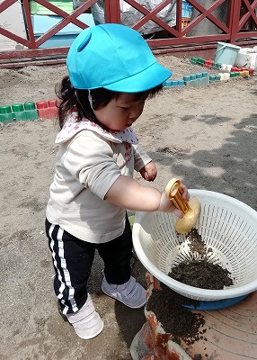 途中、保育者を見て、 「できたよ」と言わんばかりにニコッと笑います。保育者が「いっぱい、お砂、入ったね」と声をかけると、Aちゃんはどんどん砂を入れ、砂でいっぱいになりました。