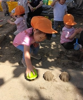 こちらでは、乾いた砂の上に水をまくと色が変わると気づき、「顔ができたよ!」。
