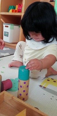 1歳児クラスの子ども達です。 積み木だけでなく「不思議な砂時計」や「くるくるパズル」など、同じ玩具を集め、積み上げ始めました。 一点を見つめ、息を止めて、真剣に積み上げています。