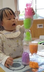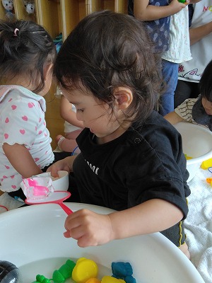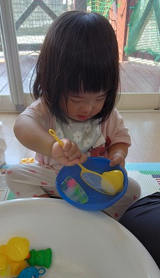 こちらは、1歳児クラスのBちゃん。保育者の手の動きを真似てカップを優しく、そーっと持ち上げました。「できた!」「アイス!」と何度も繰り返し作っています。