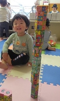 初めは、保育者が積んだ積み木を倒しては、大喜びで笑っていた子ども達ですが、倒す遊びから、積み上げる遊びへと変化してきました。