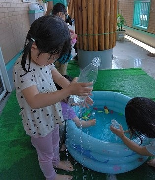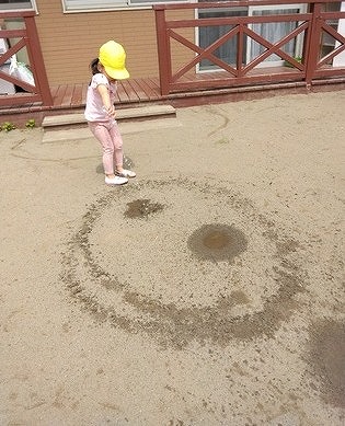テラスで水遊びをする日もあります。 このお子さんは、ペットボトルの底にあけた穴から水が落ちる様子をずっと見ています。落ちる水を手のひらで受け止めたりカップに溜めたりして、ペットボトルが空になると、また、水を入れて繰り返します。「穴から水が落ちる」「手で押さえると水が止まる」「水が溜まる」…、この小さな科学者さんは「こうするとこうなる」を実験しているようでした