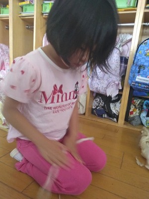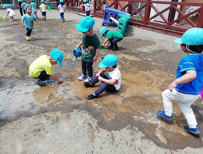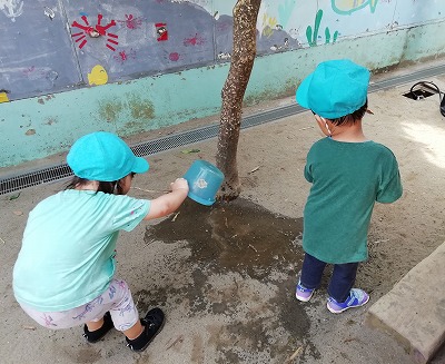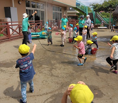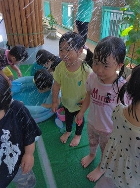 また、テラスにはこの時期、ホース・シャワー(ホースに所々、穴を開け、水が出るようにした物)を設置して遊びに取り入れています。 「雨だぁー」と見上げたり、ポタ…ポタ…と落ちてくる水滴をカップで受け止めたりしていますが、なにより「きもちいい~」が一番のようです。