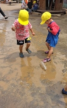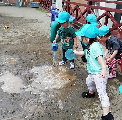 【5月下旬から、どろんこ遊び、水遊びをしています】