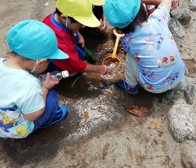 そーっと足を入れてみたり、足をバタバタさせたり、手で土を混ぜたりした時の、ぬるっとした感触や冷たさを感じながら夢中で遊んでいます。
