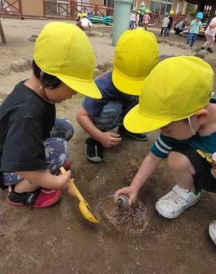そこに、3歳児クラスの子ども達も合流し、どろんこ遊びが広がっていきます。