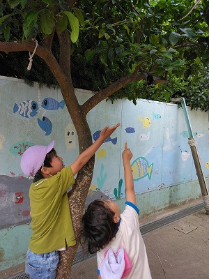 今年も、柏鳳保育園の庭にある夏みかんの木に実がたくさんつきました。子どもたちは去年を思い出し、「早くジャム、作ろうよ」「パンケーキも作りたい」と話し始めました。「夏みかんジャムを作って、ホットケーキを焼いて、ジャムをつけて食べる」が目標です。