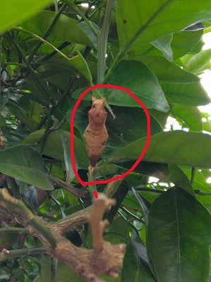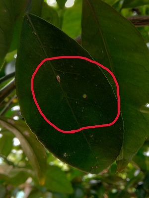 この日、園庭で遊んでいた5歳児クラスの子ども達がクロアゲハを見つけました。そのチョウは、ミカンの木の周りを旋回していました。「蜜、探しているのかな?」「ずっとクルクルまわっているね」と話をしていると、葉にとまり、卵を産みつけ始めました。