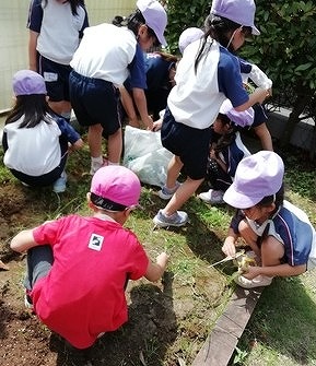 5月、まずは菜園の土作りです。皆で草(雑草)を取りました。そして、5歳児クラスの子ども達と一緒に、スイカ、枝豆の苗を植えました。「おいしいスイカ~、できるかな?」「枝豆、大きくなるかな?」と、期待がふくらみます。