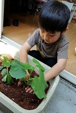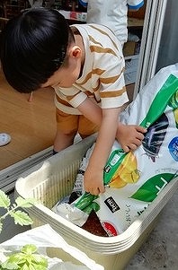 プランターにも苗を植えました。苗に優しく土をかけています。ミニトマト、フルーツトマト、キュウリを植え、トマトの横には、虫対策でパセリやバジルも植えました。
